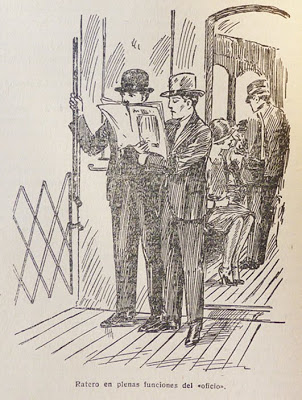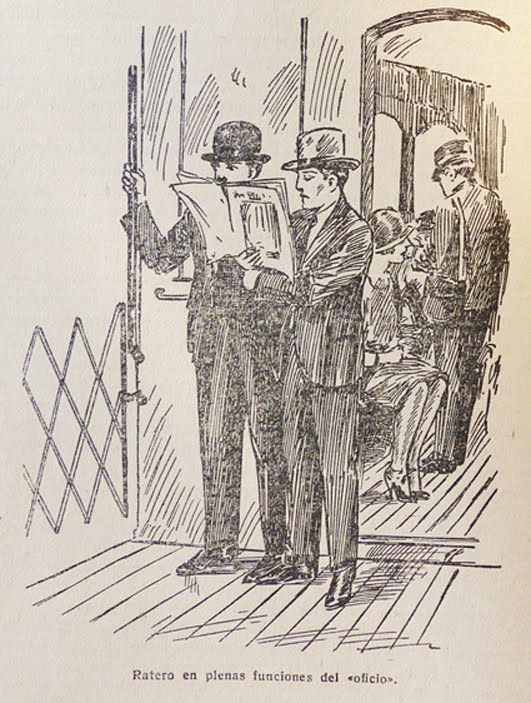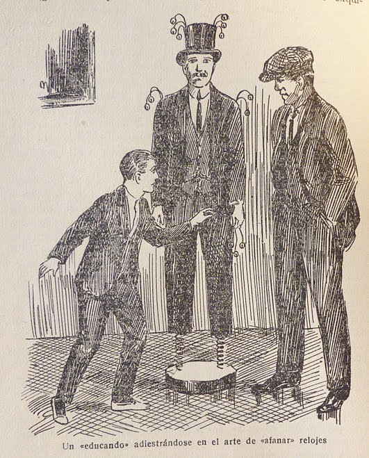 El manual se divide en cinco partes. La primera se titula, Breves apuntes sobre el arte de investigar; la segunda, Las hazañas de la dorada hampa; la tercera, La baja hampa en acción. A este apartado pertenecen las imágenes situadas al pie, dos grabados impagables que muestran a un aprendiz de afanador durante una clase y a un carterista de tranvía.