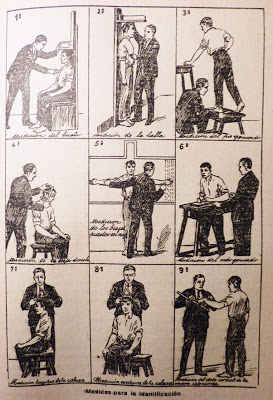 El cuarto gran apartado es Vulgarización científica, en donde resume los grandes hitos de la criminalística de la época; recojo, a modo de ejemplo, la lámina con instrucciones para la correcta manera de tomar medidas a un sospechoso. La última parte del manual se dedica a las Lacras sociales, que estaban, según el autor, en el origen de la delincuencia.