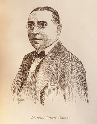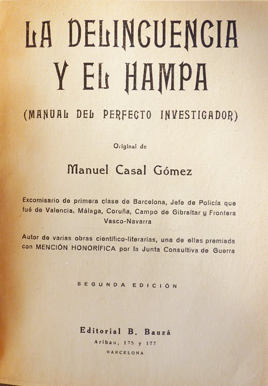 El caballero cuya imagen abre esta entrada es Manuel Casal, excomisario de policía y autor de uno de los manuales de investigación más populares de los años 30 y 40. El libro —del que adjunto la portadilla— se titulaba La delincuencia y el hampa (manual del perfecto investigador).
